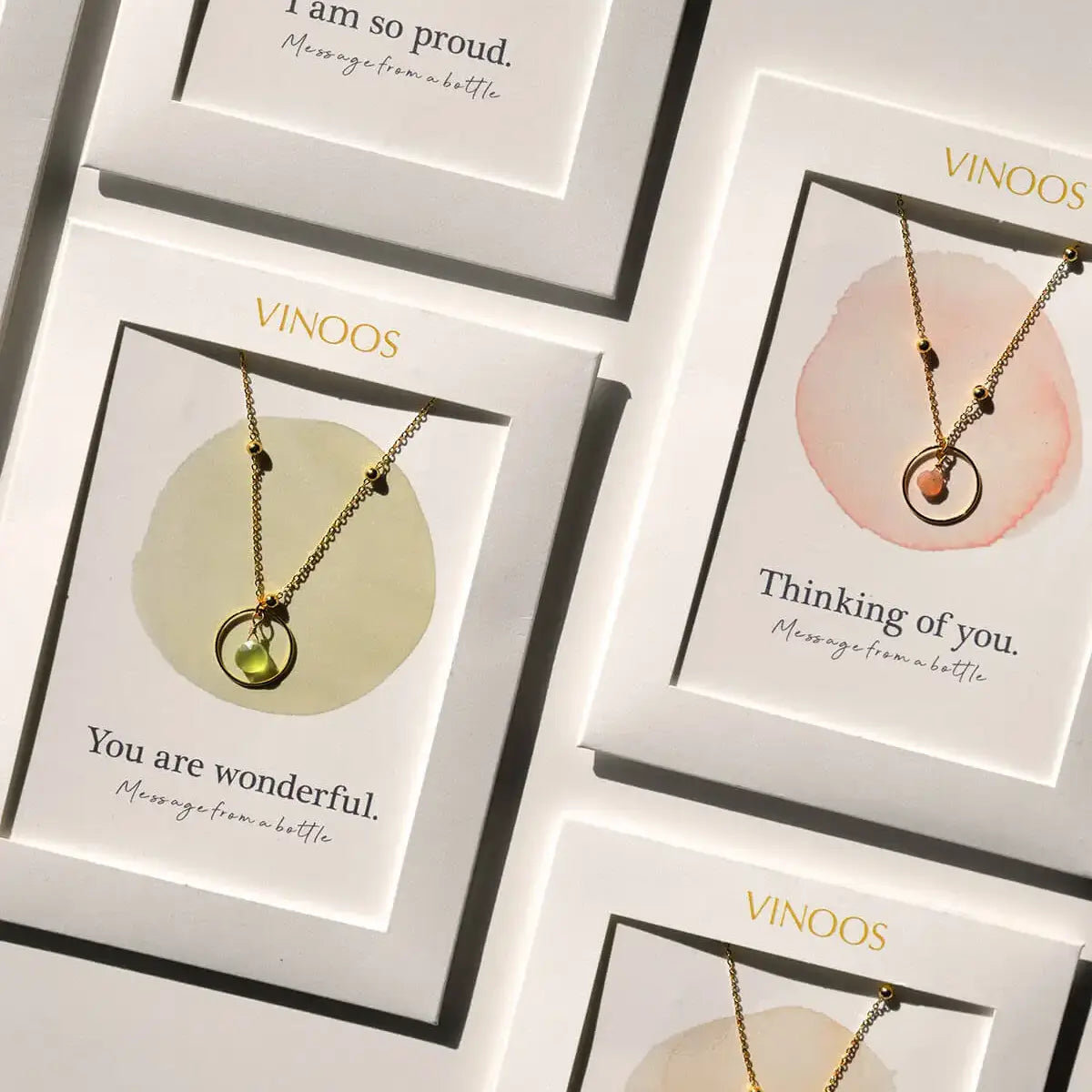 Vanuit haar concept Vinoos bedacht ze daarom het upcycling concept Vinoos Wine Jewellery – Message from a bottle. Hiervoor worden oude, lege wijnflessen, in samenwerking met Nederlandse glasateliers, omgesmolten tot prachtige kralen en verder handmatig verwerkt in het Vinoos atelier. Alle sieraden zijn gemaakt van high quality stainless steel en vergezeld van een lief, klein bericht dat je jezelf of een ander toe wilt wensen. Van kraal tot sieraad, een prachtige collectie in een hele mooie verpakking.