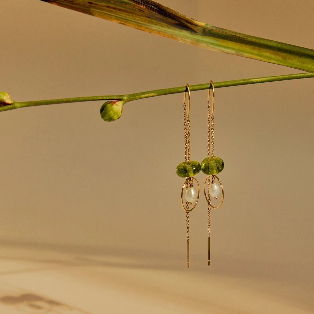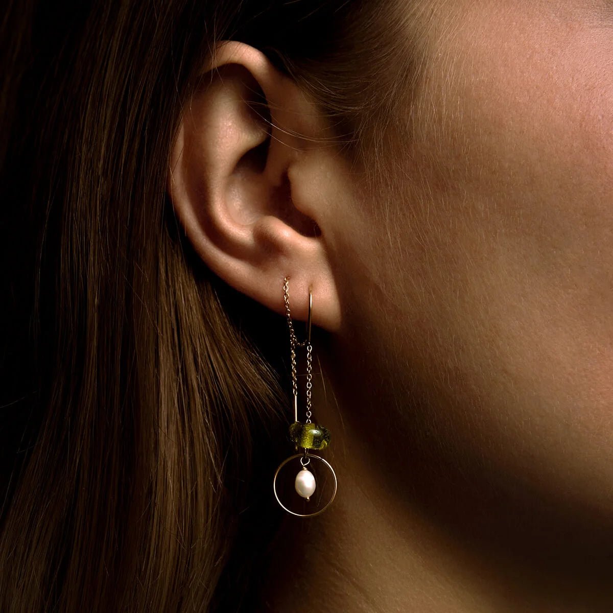 De lange “Voor Altijd” oorbel is een mooi symbool van samen zijn. Met een groene glaskraal van upcyclede wijnflessen en een kleine zoetwaterparel, straalt het duurzaamheid en verbondenheid uit. Een sierlijk en persoonlijk sieraad om de band met iemand te vieren – voor altijd samen!