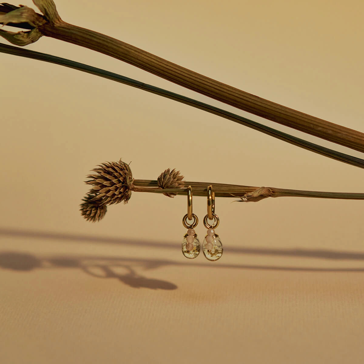 Deze feestelijke oorbel is helemaal klaar voor een feestje! Gemaakt van een transparante glas van upcyclede witte wijnflessen, met een speels vleugje bladgoud glitters. De kleine maansteen hanger maakt het geheel compleet. Perfect om elke outfit een vrolijke en feestelijke touch te geven!